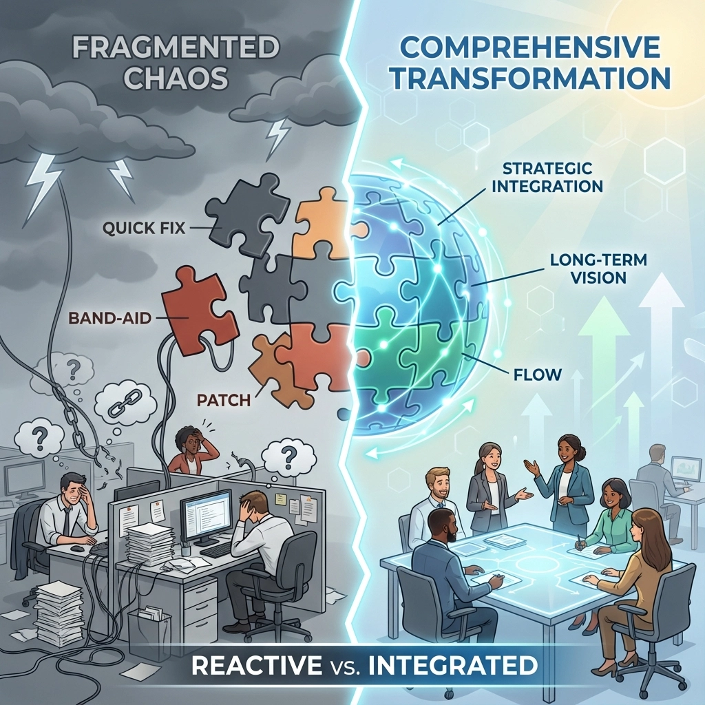 The real cost of quick-fixes isn't the initial investment: it's the opportunity cost. While you're patching individual problems, competitors implementing comprehensive transformation are building systematic advantages that compound over time.